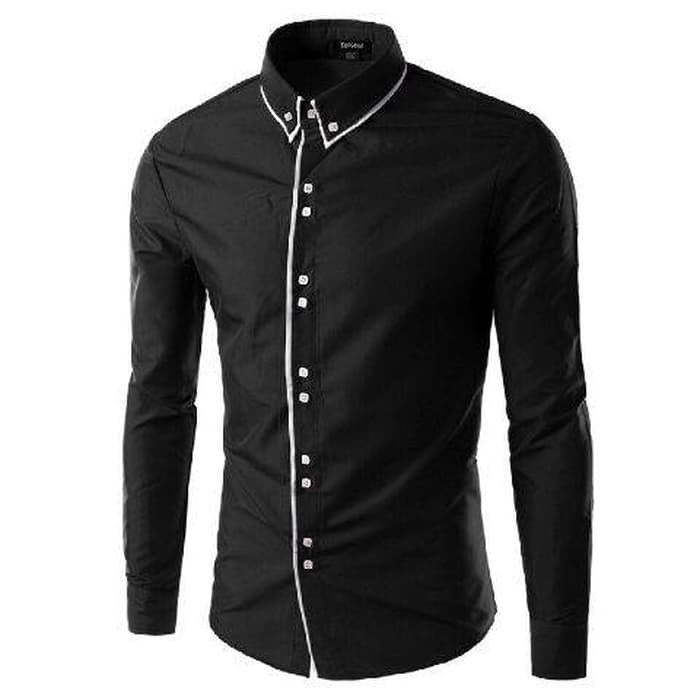 [Hem Twoline black OT] pakaian pria kemeja slim fit warna hitam Bergaya gak usah mahal Harga murah tampil mewah bahan katun stretch, ukuran all size lebar baju 50cm +-2cm (pengukuran dari lebar dari ujung jahitan ketiak ke ketiak) panjang 68cm+-1cm (pengukuran dari kerah bawah ke ujung bagian b